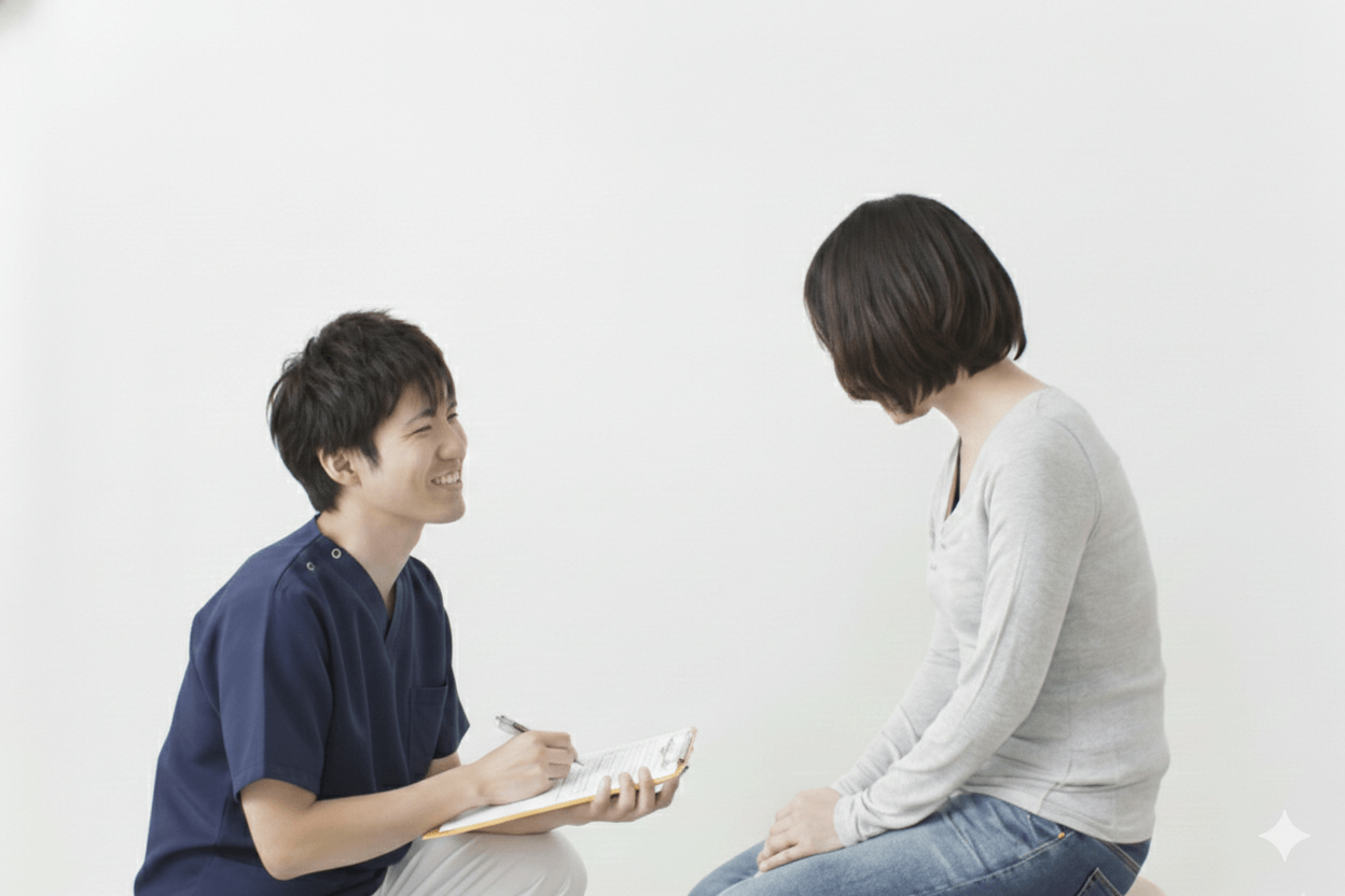 お越しいただいて、問診票の記入をお願いします。いつから、どのように痛むのか、既往歴などご記載いただきます。