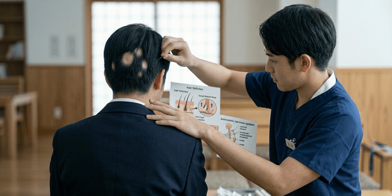 まず脱毛している部分に対しては、周囲を囲むように鍼を打ちます。